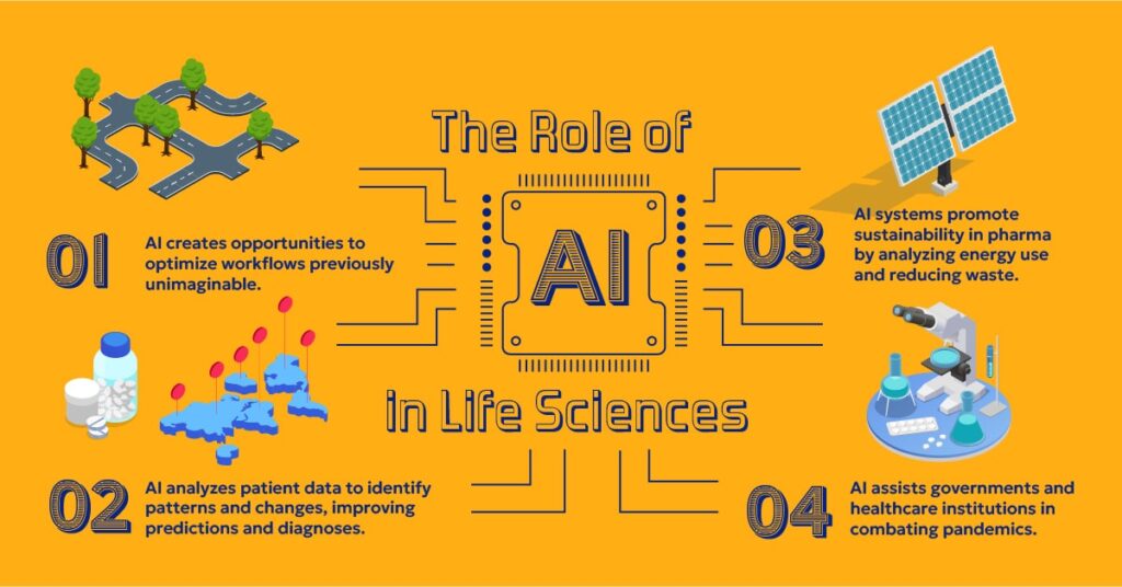 AI plays an important role in life sciences since it can create new opportunities, analyze patient data to identify patterns and changes, make predictions, and even help humans achieve breakthroughs faster.